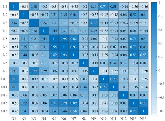 In this section, the Gamma test was used to select the combination of variables from numbers 1–13, 15, and 16 in Table 2 (13 and 14 were not taken into consideration because they were constants on a time scale) that had significant impacts on the generation of the streamflow in the temporal dimension, and the results of the forward and backward selection are shown in Table 4. The variable combination of 1, 2, 3, 4, 6, 7, 8, 15, and 16 was found to have the best performance (with the minimum value). Variable correlations in the temporal dimension are shown in Figure 4. It can be seen that the correlations between variables 5, 6, and 7 were relatively stronger (>0.90).