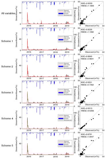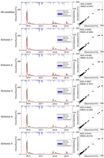 For both the Fuping and Zijingguan catchments, scheme 4 had the highest NSE and the lowest RMSE value, and the number of variables in scheme 4 was relatively small (11). The lower number of input variables indicates a lower complexity of the constructed model and the faster operation speed in real-time forecasting. Considering this, scheme 4 was chosen as the best scheme for the combination of input variables for the two catchments.