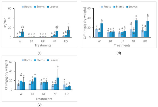 Figure 5. Effects of TTE on the mineral nutrition of Sesbania plants. (a) Na+ concentration; (b) K+ concentration; (c); K+/Na+ ratio; (d) Ca2+ concentration; and (e) Cl concentration. W: Well water; BT: Biological treatment; UF: Ultrafiltration; NF: Nanofiltration; and RO: Reverse Osmosis. The means of three observations (± standard deviation) followed by the different letters in each organ are significantly different according to Tukey’s test at the level of p < 0.05.