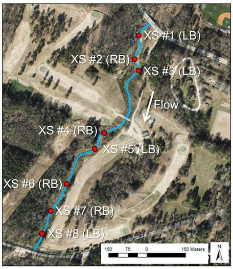 The study reach consisted of 905 m of restored channel along Richland Creek, which is located within the Neuse River basin (USGS Hydrologic Unit 03020201) in the Northern Outer Piedmont ecoregion of the Piedmont physiographic region of North Carolina, USA (Figure 1). Richland Creek is a second-order, sand-bed stream with a drainage area of 20.2 km2. Its watershed is characterized by 35% forest land, 35% agricultural land, and 30% developed land, with less than 10% impervious area [31]. The 905 m restored reach extended from Stadium Drive at its upstream end (35°59′5.1″ N, 78°31′10.93″ W) to Durham Road at its downstream end (35°58′41.9″ N, 78°31′25.6″ W), located within the Town of Wake Forest in Wake County. Along the restored reach, average channel slope was measured as 0.0026 m/m, average channel width as 8.4 m, average bankfull depth as 1.07 m, and channel sinuosity as 1.1. The restoration project was completed in 2010 for mitigation administered by the Division of Mitigation Services (DMS) from the North Carolina Department of Environmental Quality (NCDEQ). The project focused on the modification of channel cross-sectional geometry and longitudinal alignment, the installation of in-stream structures (including rock cross vanes, riffle grade controls, and rock sills) and the planting of vegetation along the banks. The study reach was selected because measured data obtained from six years of post-restoration monitoring reports showed pronounced morphodynamic adjustments that included bed erosion and deposition, and bank retreat [32]. When compared to baseline conditions in 2010, reported reach-scale adjustments through 2016 included reductions of approximately 26% in bankfull cross-sectional area, 7.5% in bankfull width, and 4.6% in bankfull depth. Post-restoration measured data also suggested a highly dynamic bed. When compared to baseline conditions in 2010, the reach-scale bankfull depth decreased by 35% through 2011, then increased by 10% through 2012, reducing again by 43% through 2014. Further details about the restoration project (e.g., pre-project existing conditions) can be found in the publicly available NCDEQ-DMS post-restoration annual monitoring reports [33].