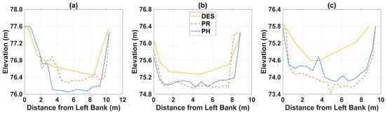 BEHI is a form-based, local-scale model that assesses bank conditions and erosion potential [14]. The application of the BEHI assessment is based on five metrics and two adjustment factors. The five metrics, which can be directly measured or visually estimated, include bank height to bankfull height ratio, root depth to bankfull height ratio, root density (as a percentage), bank angle, and surface protection (as a percentage). The two adjustment factors account for bank material and bank material stratification. A detailed description of the BEHI assessment is provided by Rosgen [14]. Once these metrics and adjustment factors are estimated, they are converted into a BEHI score, and its corresponding rating is determined. BEHI metrics and adjustment factors were estimated in-situ for the bank sides indicated in Figure 1 simultaneously with the collection of the PR and PH geometries. BEHI scores and ratings for these geometries are presented in Table 3. BEHI ratings indicated the degree of bank erosion potential along the study reach, ranging from low (score < 19.5) to moderate (score < 29.5) to high (score < 39.5) to very high (score < 45). BEHI scores and ratings were not estimated for the DES geometry because of the static nature of the BEHI assessment, which requires in-situ measurements and observations at a given point in time.