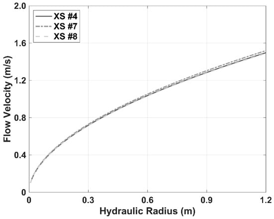 The methodology proposed by Brownlie [47] for sand-bed channels was used to develop state-discharge predictor curves at the eight cross-sections shown in Figure 1. Brownlie’s methodology, which has been effectively applied in similar studies (e.g., [48]), is based on laboratory and field data that included bed material characteristics such as those of the study reach. The required sediment properties, which included d50 and the geometric standard deviation [49], were determined from the obtained grain size distributions. The stage-discharge predictor curves depicted a very similar relationship between hydraulic radius and flow velocity because of the low variability in bed material grain sizes along the study reach (Table 1). An illustrative example of such similarity is presented in Figure 3, which shows the state-discharge predictor curves developed for cross-sections XS #4, XS #7, and XS #8. Moreover, the stage-discharge predictor curves indicated that the study reach was controlled by the lower flow regime at conditions near bankfull, implying that bedforms were present (e.g., ripples and dunes) and that form roughness predominated [49].