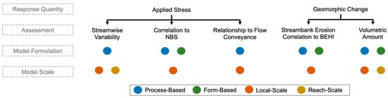 At the reach scale, model selection was dictated by the degree of mobility of the bed material. It was shown that a process-based, reach-scale model, such as HEC-RAS 1D, was needed to accurately analyze streams with fine-grained beds, in which feedback effects between sediment transport and bank retreat are important. Results indicated that failing to account for these feedback effects underpredicted volumetric amounts of geomorphic change by up to three orders of magnitude. In the case of applied stresses, comparisons against measured post-restoration data suggested that fixed-bed approaches, such as BSTEM, rendered a more accurate quantification of maximum values that were experienced for a given cross-sectional geometry. As implemented herein, values of applied shear stress obtained from the quasi-unsteady, mobile-bed HEC-RAS 1D simulations were representative of quasi-equilibrium conditions, which could be attained in practice only if the incoming water discharge was associated with a sufficiently large temporal scale.