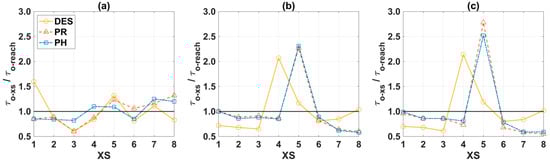 The streamwise variation of τo at each cross-section (τo-xs) normalized by τo-reach is shown in Figure 5 for the DES, PR, and PH geometries as predicted by BSTEM, HEC-RAS 1D, and HEC-RAS 1D & BSTEM. Such a normalization highlighted locations that were prone to experience geomorphic change as indicated by the magnitude of τo-xs/τo-reach. BSTEM results suggested that the three geometries performed similar to their reach-averaged behavior (i.e., τo-xs/τo-reach~1) (Figure 5a). Alternatively, HEC-RAS 1D and HEC-RAS 1D & BSTEM results showed cross-sections where τo-xs/τo-reach > 2, highlighting locations that were prone to experience pronounced geomorphic change due to the effect of bed material transport dynamics (Figure 5b,c). For the DES geometry, XS #4 experienced the highest relative level of τo, with τo-xs/τo-reach equal to 2.07 and 2.14 as predicted by HEC-RAS 1D and HEC-RAS 1D & BSTEM, respectively. As shown in Figure 2a, XS #4 had indeed undergone severe bank retreat between 2010 and 2018 (average RB retreat was 0.9 m). Moreover, for the PR and PH geometries, XS #5 had the highest relative level of τo, with values of τo-xs/τo-reach ranging between 2.27 and 2.78 as predicted by HEC-RAS 1D and HEC-RAS 1D & BSTEM. Cross-sectional measurements for these geometries showed that XS #5 experienced severe bank retreat following the severe floods in 2018 (average LB retreat was 0.6 m) [34]. Moreover, for the PR and PH geometries, τo-xs/τo-reach < 1 for XS #4, consistent with the relatively lower degree of geomorphic change experienced following the severe floods in 2018 (average RB change was 0.2 m) (Figure 2a).