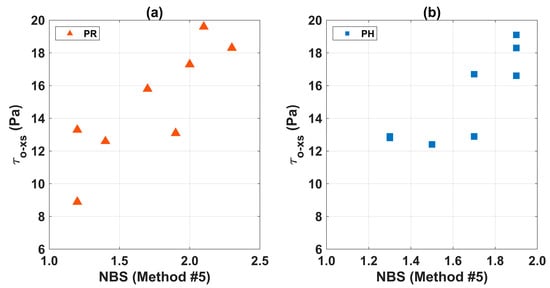 At a local scale, the Pearson’s correlation coefficient (ρcoeff) [62] was calculated to examine the linear dependence between BSTEM process-based predictions of τo at each cross-section (τo-xs) and NBS (Method #5) form-based parameterizations of τo. These data are shown in Figure 6 and corresponded to ρcoeff of 0.85 for the PR geometry (Figure 6a) and ρcoeff of 0.83 for the PH geometry (Figure 6b). Statistically, the high values of ρcoeff suggested that a satisfactory and positive correlation existed between the variables, meaning that as the NBS (Method #5) parameterization values increased, so did the BSTEM-predicted τo-xs. However, from a physics-based perspective, the NBS (Method #5) parameterization did not provide a quantitative understanding of the magnitude of τo-xs; rather, it only provided a qualitative assessment of banks that were likely to experience high applied stresses. Additionally, this qualitative assessment did not capture site-specific conditions that impacted the magnitude of τo-xs, such as its distribution along the bank profile included in BSTEM [57].