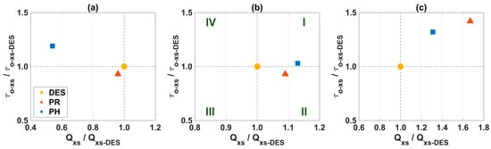 Values of Qxs and τo-xs for the Post-Restoration (PR) and Post-Hurricane (PH) geometries normalized by those corresponding to the Design (DES) geometry (Qxs-DES and τo-xs-DES) for (a) XS #4, (b) XS #7, and (c) XS #8. Quadrant Descriptions: I—widening with bed erosion and bank retreat; II—widening with bed deposition; III—narrowing with bed deposition; and IV—incision with bed erosion and bank retreat.