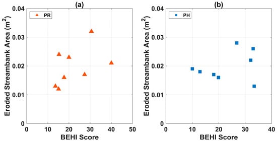 At the local-scale, the Pearson’s correlation coefficient (ρcoeff) [62] was calculated to examine the linear dependence between BSTEM process-based predictions of eroded bank area at each cross-section and form-based BEHI scores for bank erosion potential. These data are shown in Figure 8, where the eroded bank area represented the detached area in the direction perpendicular to the flow normalized by the input duration of flow. Results corresponded to ρcoeff of 0.47 for the PR geometry (Figure 8a) and ρcoeff of 0.29 for the PH geometry (Figure 8b). Statistically, the low values of ρcoeff indicated that the correlation between these variables was not strong, meaning that the eroded bank area computed by BSTEM did not consistently increase with increasing BEHI scores. Results in Figure 8 suggested that BEHI scores were not able to capture the measured morphodynamic adjustments following the severe floods in 2018. Even though the correlation was not strong for the PR geometry with ρcoeff = 0.47, it significantly deteriorated for the PH geometry with ρcoeff = 0.29. This trend suggested that BEHI scores may not have the resolution to accurately describe these types of short-term morphodynamic adjustments.