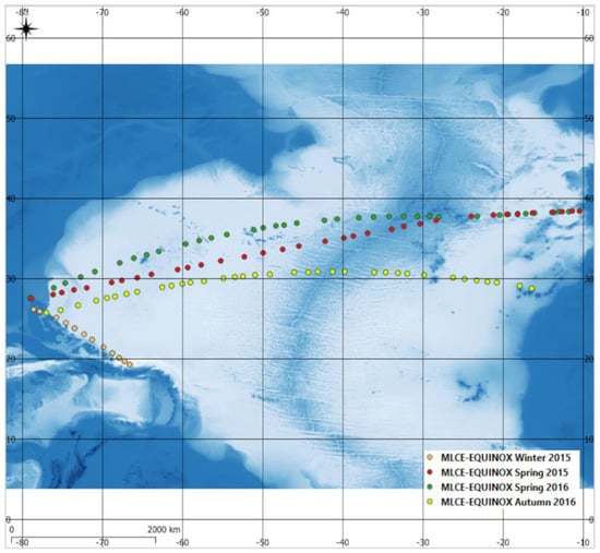 From 7 March 2015 to 6 November 2016, the M/V Equinox (ID: MLCE) sailed across the North Atlantic Ocean three times. Discrete surface underway measurements of seawater DIC, TA, and pH were performed on all cruises (Figure 1). The details of the laboratory methods onboard the M/V Equinox are well documented [23] as NCEI Accession 0154382. This research was conducted in support of the coastal monitoring and research objectives of the NOAA Ocean Acidification Program (OAP) and the Climate Program Office. The research cruise covered an area from −78.9797° W to −10.3998° E and from 38.4622° N to 19.2893° S.