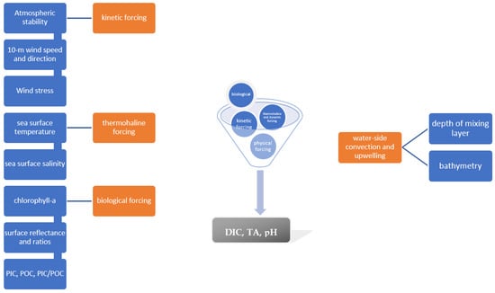 Figure 2. Linkage between the various groups of environmental drivers and how these were used to model or predict the three target parameters of surface DIC, TA, and pH. The environmental drivers can be seen as representing some of the main met-ocean processes influencing these three target variables (based on [38]).