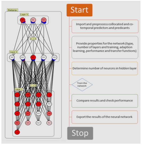 The training of the BPN algorithm started by using a small, random weight. It propagated each input pattern to the output layer, compared the pattern in the output layer with the correct one, and adjusted the weights according to the back propagation learning algorithm. After the presentation of around 10,000 patterns, the weights converged, i.e., the network picked up the correct pattern, and the error-correction learning stopped. In so doing, the network systematically reduced and/or reinforced the weights of the connection architecture and all of the ‘knowledge’ in the BPN was then contained in the weights. Naturally, the magnitude of this error depended on the choice, relation, quality, and accuracy of the inputs (predictors).