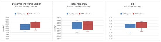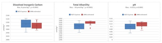 Figure 5 shows the distribution and the statistical significance of the data points within the range that is shown by both in situ and ANN-estimated values, as well as the existence of outliers. The co-located, ANN-estimated DIC, TA, and pH values were in very good agreement with the surface underway measurements given that the BPN algorithm was trained on the data that were collected during 28 April–6 May 2015 along the entire North Atlantic width. The results show that the mean biases for DIC, TA, and pH are −2.5 μmol.kg−1, −3.2 μmol.g−1, and 0.0048, respectively. Compared to the range of DIC, TA, and pH that is shown by the surface underway measurements along all of the transects (Table 1), the values for the mean bias show low variations and a good ANN algorithm performance. Importantly, apart from the fact that no outliers were detected, the overall dispersion of the ANN-estimated values is well within the range of those shown by the M/V data. Some skewness is shown by the ANN-estimated pH and, to a lesser extent, for DIC. The similarity between these three sets of data is statistically significant at the 99% confidence level.