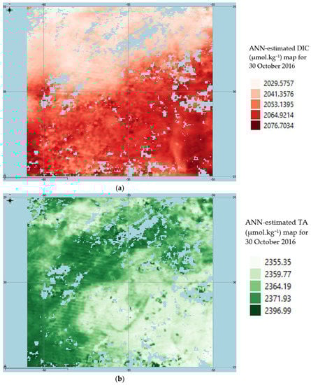 All of the grid-point predictor variables were inserted in the BPN algorithm and the values of DIC, TA, and pH were modeled for that day for the entire area, with a native grid size of 0.04167°. On 30 October, there was a total of 7897 empty grid cells in this area that were attributed to cloud cover and, therefore, the lack of optically retrieved remotely sensed predictors (i.e., chlorophyll-a, Rrs, PIC, and POC).