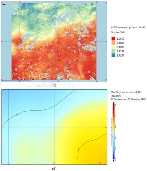 Figure 8. Modeled, gridded (a) DIC, (b) TA, and (c) pH maps for the ROI produced by the ANN algorithm. The spatial resolution is 0.04° × 0.04°, which corresponds to the native spatial resolution of some of the predictands. The (d) pCO2 map valid for 30 September until 31 October 2016 has been inserted for reference [78]).
