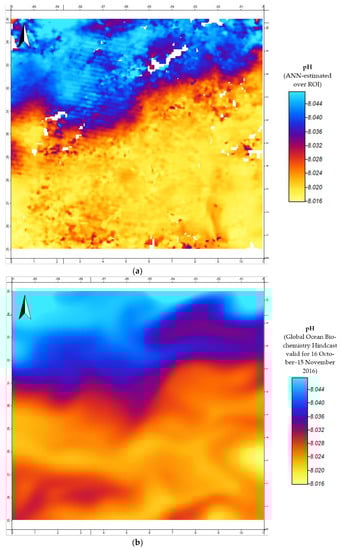 Figure 9. pH distribution map (a) ANN-estimated pH valid for 30 October 2016; (b) extracted from the Global Ocean Biochemistry Hindcast valid for 16 October–15 November 2016, and (c) scatterplot between (a) and (b) (R2 = 0.81).
