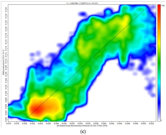 Entire M/V Equinox cruise transect datasets were reserved and used as independent datasets to validate the performance of the BPN training method. This is a common practice that ensures that the model can produce reliable estimates outside the range of the learning data (generalization capabilities) [78]. Thus, by assigning the trained BPN algorithm with the values of the fixed set of co-located and co-temporal input neurons as the physico-chemical and biological drivers, the resulting ANN-output-modeled DIC, TA, and pH were validated against the assigned datasets (Table 1).