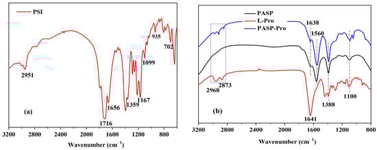 FTIR spectra of PSI, L-Pro, PASP, and PASP-Pro on the synthetic route. PSI (a); L-Pro, PASP, and PASP-Pro (b).