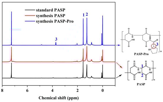 Figure 3 is the 1H NMR spectra of the synthesized PASP, PASP-Pro, and standard PASP in CDCl3. The signals of the synthesized PASP are consistent with the standard PASP, the peak of which at 1.25 ppm and 2.58 ppm are assigned to -CH2- and –CH- of PASP main chains, respectively. A new peak at 3.74 ppm that emerges in the 1H NMR spectra of PASP-Pro is attributed to the CO-CH2-NH on the ring of L-Pro.