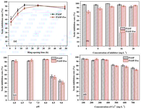 Figure 5a shows the effects of the ring-opening time on the scale inhibition performance of the PASP and PASP-Pro. When the ring-opening time is less than 13 h, the scale inhibition rate increases with the extension of the ring-opening time; however, the scale inhibition performance decreases slightly after the ring-opening time exceeds 13 h. The reduction in the scale inhibition rate of PASP-Pro is lower than that of PASP. The ring-opening reaction time can directly affect the molecular weight of the synthesized PASP-based scale inhibitors. When the reaction time is short, the PSI ring-opening reaction mainly occurs and the molecular weight of the synthesized PASP is large; when the reaction time is long enough, the amide bonds on the main chain of the PASP are broken, resulting in a large number of PASPs with short chain lengths. As we know, the corresponding molecular weight is related to the best scale inhibition performance; PASP and PASP-Pro showed the best scale inhibition performance when the ring-opening time is about 13–25 h. The corresponding molecular weights are 2456 to 4610 and 3012 to 4751, which are basically consistent with those reported in the literature [30].