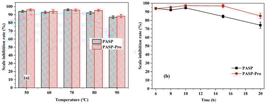 The scale inhibition performance of PASP-Pro is much higher than that of PASP after heat treatment at 110–170 °C (Figure 7a). At 110 °C, the scale inhibition rate of PAPS-Pro exceeds 90%, which is almost as high as without heat treatment. After heat treatment at 150 °C, the scale inhibition rate is still higher than 87%, which is significantly higher than the scale inhibition rate of PASP (74%) at the same heat treatment temperature. When the heat treatment temperature is increased to 170 °C, the scale inhibition rate of PASP-Pro decreases significantly and becomes unable to meet the use requirements. However, it is worth noting that the temperature of common geothermal well water is lower than this value, which means that PASP-Pro still has a broad application prospect in geothermal water.
