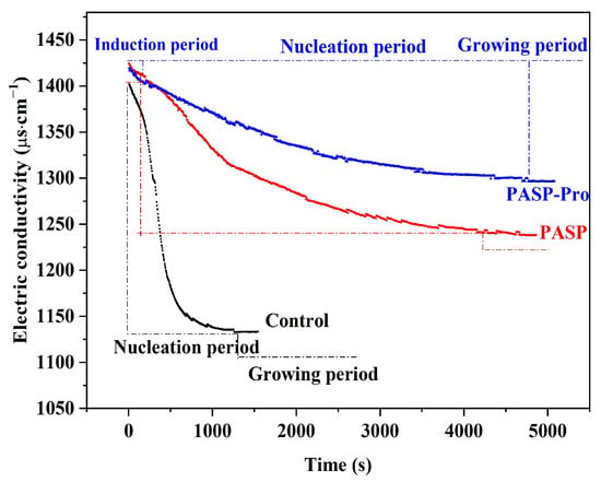 In general, the CaCO3 nucleation process can be divided into three stages: induction period, nucleation period, and crystal growth period [33]. During the nucleation period, the conductivity of the critical supersaturation CaCO3 solution dropped rapidly. As time went by, the conductivity decreased slowly to a stable value; the constant conductivity value in the growth period is related to the rearrangement and growth of the CaCO3 nucleus. Figure 8 shows the conductivity change in the solutions containing CaCl2 and Na2CO3, which is clearly distinguished from the absence or presence of scale inhibitors. In comparison, the addition of scale inhibitors significantly prolonged the induction period and nucleation period, indicating that the migration of ions in the solution occurs slowly, which may be related to a large amount of negatively charged functional groups in PASP and PASP-Pro. This reveals that scale inhibitors also hinder the formation of ACC. In addition, the conductivity value in the final stage of solution after adding PASP-Pro is higher than that of PASP, with more free ions in the solution indicating that there are fewer Ca2+ and CO32− ions participating in the formation of crystal nuclei in the solution.