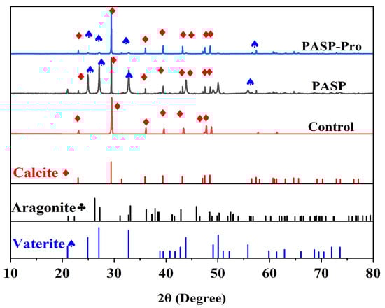 Figure 9 shows the structures of CaCO3 scale crystals by XRD. The diffraction peaks at 2θ = 23.1°, 29.4°, 36.0°, and 39.4° correspond to calcite. This demonstrates that only calcite is formed in the absence of the scale inhibitors; however, the characteristic peaks of vaterite at 24.9°, 27.0°, and 32.8° can also be found in the presence of PASP or PASP-Pro, but there are obvious differences in the intensity of vaterite characteristic peaks between PASP-Pro and PASP. The characteristic peak intensity of vaterite was lower when PASP-Pro was added. We used jade 6.5 to calculate the relative content of various crystals of calcium carbonate, and the results are shown in Table 2. Calcium carbonate added with PASP and PASP-Pro has 65.47% and 5.89% relative content of aragonite, respectively. Calcite crystal is the most thermodynamically stable crystal, while vaterite crystal is the most unstable [34]. The addition of PASP and PASP-Pro scale inhibitors effectively prevents the generation of stable scale and promotes the conversion of CaCO3 nuclei to vaterite. This is most likely because the scale inhibitors adsorbed on the crystal surface cause lattice distortion and then affect the path of ACC to calcite, thus changing the structure of the CaCO3 scale.