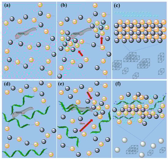 The schematic diagram of multi-stage nucleation. Ionic liquid polymer collapse and dehydration in the absence of PASP (a–c); in the presence of PASP (d–f).