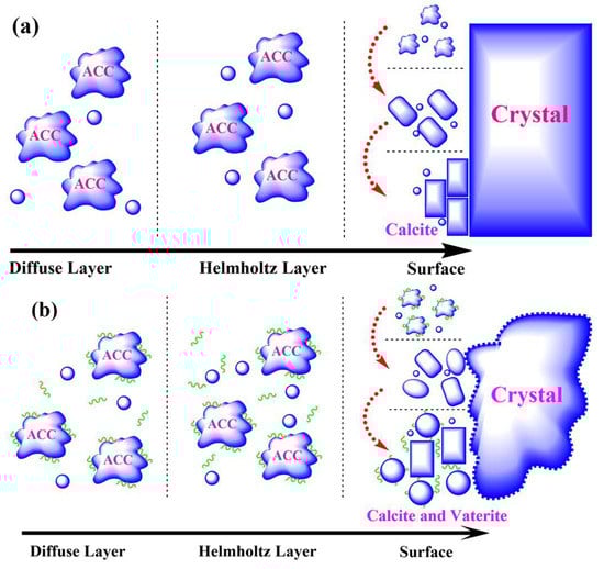 In general, for the CaCO3 crystallization process, amorphous calcium carbonate (ACC) is formed first, and then converted into thermodynamically stable polycrystals including calcite, aragonite, and vaterite through different pathways. For example, a transformation mechanism from hydrated ACC via a short-lived anhydrous ACC to the final polymorph was suggested where the crystalline phase propagates via secondary nucleation from one domain to its neighbor [15,16,17]. However, the crystal nucleus size is very small, and its formation speed is extremely fast, which makes it difficult to obtain a detailed description of the CaCO3 crystallization process. With the development of observation technology and computational chemistry, a more generally accepted mechanism is the multi-stage nucleation process of CaCO3, which has been proposed. This process can be divided into the following stages [18,19,20]: (1) Formation of amorphous ionic liquid. Ca2+ and CO32− ions are alternately arranged to form a highly disordered, flexible, and hydrated dynamic topological structure composed of chains, branches, and rings. (2) Formation of ACC. Amorphous ionic liquids will collapse and aggregate into 3D ACC spherical particles during the dynamic process of formation and dissipation, and the local dehydration sequence results in a more orderly structure at the same time. (3) Transformation into a more stable crystal form. There are two kinds of viewpoints on this process: one is the dissolution precipitation model (Ostwald–Lussac rule of stages), in which ACC precursors are redissolved on the stable crystal surface before precipitation; the other is ACC precursors directly convert into stable crystalline phases based on the continuous contact between the old and new phases.