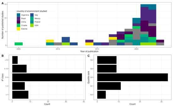 Articles on rotifer functional diversity: (A) Country of environment studied; the countries with at least three published studies are shown; grey color refers to countries with <3 published studies; (B) number of studies binned by IF classes; (C) number of studies binned by the quartile rank; NA refers to studies with no IF.