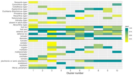 Heatmap of percent distribution of morphological traits within clusters 1 to 10 as assembled by hierarchical, divisive clustering. Black horizontal lines separate different traits; within traits, numbers sum up to 100%.