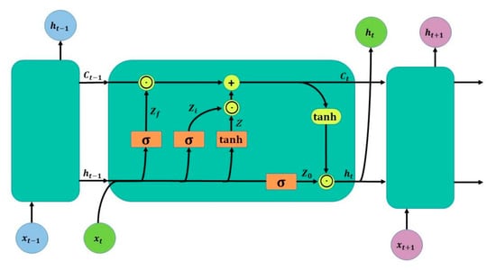 In this figure, ⊙ represents the Hadamard product of the matrix, i.e., the corresponding elements of the operation matrix are multiplied, and ⊕ represents the performed matrix addition. The calculated Zf (f for forget) is the forget gating, and Zi (i for information) is the selection gating. The results obtained from the above two steps are summed to obtain the Ct transmitted to the next state. The output stage is mainly controlled by Z0 and the Ct obtained in the previous stage is deflated (changed by a tanh activation function) to finally obtain the output ht of the current state. The specific calculation process is as follows.