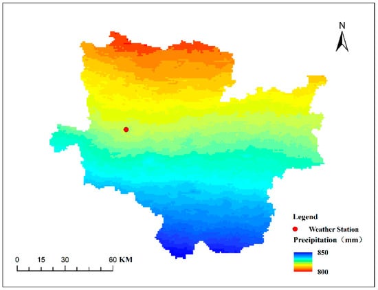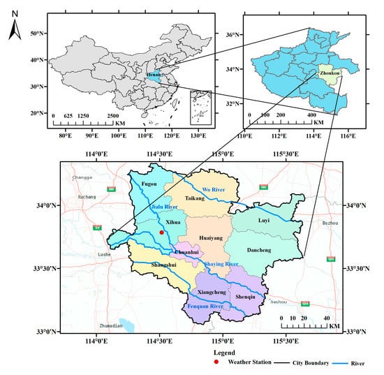 Zhoukou City is located in the central-eastern part of Henan Province, with an area of about 12,000 square kilometers. It is in the middle latitude between the Yellow River and the Huai River, with a flat topography and an elevation between 35.5 and 64.3 m, and belongs to the warm temperate semi-humid semi-arid continental monsoon climate. It is characterized by cold winters and hot summers, rain, and heat in the same period, with an annual average temperature of about 13–22 °C. Daily historical precipitation data were obtained from the National Centers for Environmental Information (https://ngdc.noaa.gov/ (accessed on 20 November 2022)). Longitude and latitude coordinates of weather stations were downloaded from the website, imported into ArcGIS software, and then correlated with the study area to determine the locations of weather stations situated within the study area. The location of the weather station in the study area is illustrated in Figure 2.