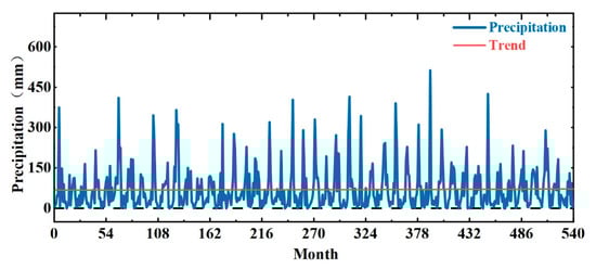 Normal precipitation can contribute to the regional water cycle as a positive feedback process. However, global warming due to greenhouse gas emissions is profoundly affecting regional precipitation patterns, with the IPCC Assessment Report 6 indicating that anthropogenic warming reached about 1 °C (±0.2 °C) in 2017, and that average precipitation in the high northern hemisphere will increase significantly when global warming is 1.5 °C or 2 °C compared to pre-industrial conditions []. For example, Chen, J.L. et al. [] showed that water vapor transport from the Indian monsoon region and the South China Sea in the context of global change becomes an important condition for strong summer precipitation in southern and eastern China; Zhou, T.J. et al. [] also demonstrated that the alteration of water vapor transport channels in the western Pacific Ocean in the context of global change has a more significant effect on summer precipitation anomalies in China. The increase in precipitation events will inevitably lead to a series of serious consequences, so it is necessary to make accurate predictions of future rainfall trends based on available rainfall data to provide technical support for the sustainable use of regional water resources and disaster prevention and mitigation [].