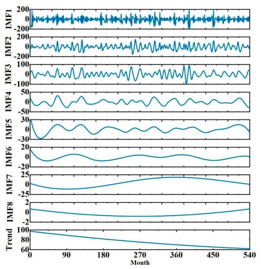 As can be seen in Figure 6, the frequencies and amplitudes of the IMF1 and IMF2 components are still at a high level but with less fluctuation and more smoothing than the original data. The frequencies and amplitudes of IMF3–8 decrease gradually with the trend term, and the series gradually tends to be smoother.