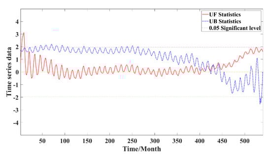 By reversing the time series x to xn, xn−1,…, x1, and repeating the above process while setting UBk = −UFk for k = n, n−1,…, 1 and UB1 = 0, we can obtain a change point detection plot []. Among them, the value of UF is greater than zero, indicating that the sequence is in an uptrend, and vice versa. If the two curves of UF and UB intersect between the critical line, the moment corresponding to the intersection point is the time of the start of the mutation. The advantage of this method is that it is not only computationally simple but also able to determine the time when the change point begins and identify the change point region, making it a commonly used method for change point detection.