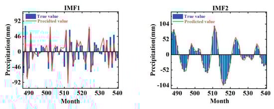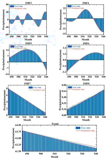 The study utilized a specific method to divide the precipitation data into a training set and test set. From the 540 months of precipitation data, the first 486 items were designated as the training samples, and the last 54 items were used as prediction samples. The component LSTM model was constructed in turn using this approach. The study then employed a step-by-step prediction method of dividing the training–test set to predict each component.