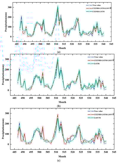 The predicted values of all components and trend terms were summed to obtain the predicted values of monthly precipitation in Zhoukou City, and the prediction results of LSTM, LSSVM, and CEEMD-LSTM models were selected to compare with this model to verify the prediction effect of the CEEMD-LSTM-LSSVM model. The comparison of the prediction results of different models is shown in Figure 10a–c, and the prediction accuracy statistics of different models are shown in Table 5.
