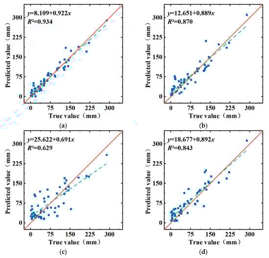 Scatterplot of observed and predicted precipitation values. (a) CEEMD-LSTM-LSSVM. (b) CEEMD-LSTM. (c) LSTM. (d) LSSVM.