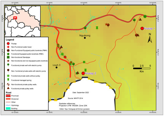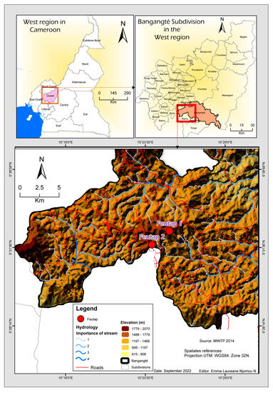 Feutap is located in the rural area of Bangangté, between latitudes 5°26′14″–5°36′ N and longitude 10°18′0″–10°29′0″ E. It is bordered to the north by the village Bangoua, to the south by the village Bahouoc, to the west by the village Bamena and to the east by Sagnam, in urban Bangangté. It is on a plateau some 1500 m above sea level. The hydrographic network clearly shows that there is no river in Feutap (Figure 1). Feutap has a sub-montane monsoon climate with a sub-equatorial character [68]. Its population, which lives mainly from agricultural activities (e.g., subsistence agriculture), is approximately 320 inhabitants. The Teacher Training College of General Education (TTCGE—Feutap 1) and the Public Nursery School of Feutap (Feutap 2) are the only government infrastructures present in this village. Besides these, there are two evangelical churches, one in Feutap 1 and one in Feutap 2.