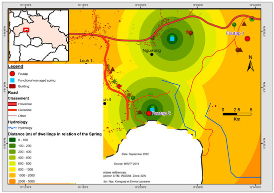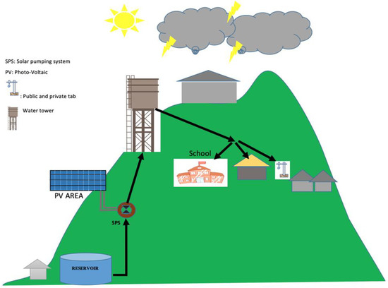 As a top-mountain locality, Feutap has no streams and/or rivers (Figure 1), and thus “irrigation water” [69] is an unknown notion. Agriculture is exclusively rain fed. There are just three springs, two in Feutap 1, and the other one in Feutap 2 (Figure 3). In Feutap 1, only one of the two springs is used by the residents, the most productive and the closer to the agglomeration. Figure 3 represents the distances to the most used springs. Water from these sources is used for cooking, drinking, and ensuring personal hygiene and clothing. The population of Feutap 1 Cogefar has its water from a borehole situated in the compound of the chief of the quarter. Anciently, this agglomeration used to go to a spring in the valley located in Bangoua. The spring in Bangoua is now abandoned but can be explored for water supply in Feutap after the Kilimanjaro Concept (Figure 4). A retention basin can be created at the source, and water is daily pumped to a tank within the agglomeration to partly cover certain needs. Using such a system for the safe drinking water supply of a school, for example, would eliminate the need for disinfection while producing in-home water (distance zero). Actually, the distance from the Nursery School of Feutap 2 to the protected spring is more than 1 km. To reduce energy costs, a solar pumping system is proposed (Figure 4).