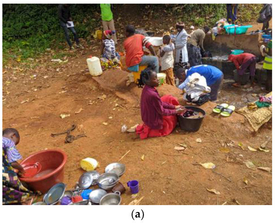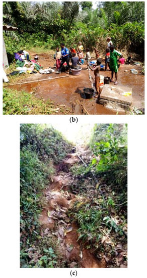 It is not very clear how the system was supposed to be managed, but it is certain that used diesel was supplied by some willing village elites. Over time, the diesel was abandoned in favor of an electric pump. The non-payment of the electric energy by the beneficiary population led to the total cessation of the operation of the standpipes after some 3 to 4 years. Today, people have to go down to the shallows to get water, with the risks that this entails and the side effects that they have almost completely abandoned water storage at home (e.g., rainwater harvesting). An adaptive way to reduce the burden of water transport, both in Feutap 1 and Feutap 2, is to wash clothes and dishes at the source (Figure 5). Figure 5c shows a photograph of the path to the spring of Feutap 2. It gives an idea of the conditions to be braved to have some liters of water. This path is necessarily slippery after rain events. Children and elderly people have to walk this path every day.