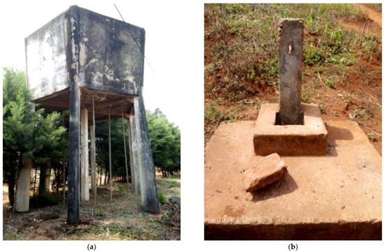 Around 1985, the rural engineers protected two natural springs: one in Feutap 1 (Figure 5a) and the other in Feutap 2 (Figure 5b). These water points are located in the lowlands, at considerable distances from the houses (≥1 km) (Figure 3). The paths leading to them are very slippery in the rainy season (Figure 5c). The high productivity of the spring in Feutap 2 had led to strategies to create a retention basin at the source and pump water to the neighboring agglomerations including in Bahouoc and Balengou. This was initially the initiative of private rich individuals (called elites) during the 1970s and 1980s. In 1985, the municipality of Bangangté (Génie Rural) installed a small centralized water supply system in Feutap 2 to reduce the distance to the spring to the whole population. Water from a protected retention tank was pumped to a water tower located near the school (Figure 6a) and used to supply the population through 12 standpipes (Figure 7). Figure 6b shows such an old ‘dry’ standpipe from which no single drop of water has flowed since the end of the 1980s (>30 years).