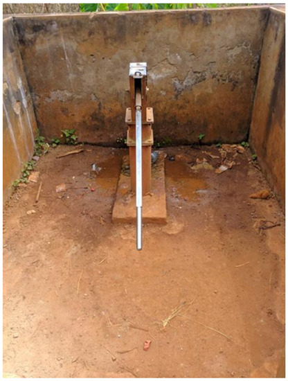 In 2008, the municipality of Bangangté constructed a borehole equipped with a hand pump at Feutap 1 [71]. This water point has regular breakdowns and almost dries up towards the end of the dry season; it is the only public drinking water point that supplies households (Figure 8). Prompt at installation, it was agreed that each household pays monthly F CFA 500 (about EUR 0.77) to assure the maintenance of this water point. Unfortunately, there was no willingness to pay, and whenever it breaks down, it is abandoned until the chief invests his own money to find a technician. In addition to these three water sources, there are four private wells in Feutap.