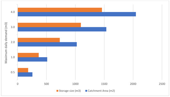 As previously stated, RWH technology is proving to be a potential water source not yet well exploited in Feutap. Given the currently unreliable water resources in Feutap, RWH can lead to water-secured communities. Considering the population of 350 people and a minimal per capita daily demand of 30 L, a constant demand strategy method [82] was used in the water storage equation (Equation (1)) to estimate the maximum capacity of storage (m3) and catchment area (m2) required to meet the target demand in a given year. A roof runoff coefficient of 80% was adopted [82], and the researchers accessed a wide range of monthly rainfall data, stretching from 1951 to 2021 (70 years’ data) [18]; thus, rainfall trends are well captured for depicting potential quantities. Figure 9 displays the variation in storage and catchment size in relation to the demand. These are the maximum values for a given demand size. The demand size analyzed varies considerably to accommodate situations where non-domestic uses such as food security and livelihood activities are to be served as well (Figure 9). Storage capacity as high as approximately 64,000 m3 will be required for meeting a daily water demand as high as 175 m3, harvested from a catchment of approximately 56,000 m2. A storage of approximately 3900 m3 will be required to meet a daily demand of 11 m3, harvested from a catchment of approximately 3400 m2. For comparison, 3400 m2 is the area covered by 43 houses having a total roof area of 80 m2 or 85 houses having a total roof area of 40 m2. Roof areas are typically larger than 50 m2 in Feutap. A Google count revealed that 460 houses are available in Feutap. Nevertheless, in the future, the local community may be advised on varying demand especially during the dry season in order to conserve more water and hence extend the supply duration. This can be achieved by limiting usage to basic needs only [83,84,85].