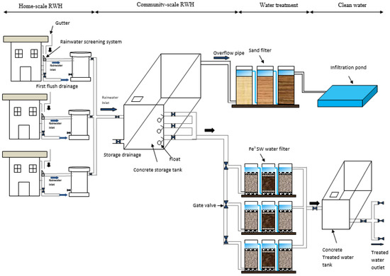 Configuration of a community rainwater harvesting system with a water treatment station. Community-scale water reservoirs are designed to collect overflows from cisterns and tanks from individual households and farms. Overflow from the community tank is directed to infiltration devices (e.g., ponds and wells). Fe0 SW filter represents a sand filter amended with steel wool (Fe0 SW) [104].