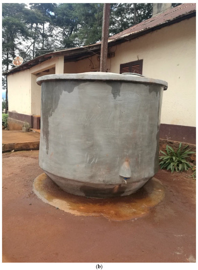 Rainwater harvesting systems in Ekpoma are founded on exploiting available structures comprising corrugated iron roofing sheets, metal pipes, plastic polyvinyl chloride (PVC) pipes, concrete, and plastic storage tanks [103]. Pragmatic tools are sometimes used to prevent debris and dirt from roofs from collecting in storage tanks [103]. Tenebe et al. [103] reported that some storage tanks were relatively well covered with corrugated iron and asbestos sheets, while other storage tanks were left uncovered. However, a common observation is that there is no system to channel the harvested water to the point of use; thus, a large majority of residents can manually withdraw water from storage wells using buckets and long ropes, which poses risk to quality maintenance. To summarize, RWH is well known and largely used in Ekpoma under climatic conditions similar to Feutap. However, there is no coordinated water harvesting program, exposing the population to several avoidable sources of potential contamination such as (i) atmospheric pollutants and (ii) dirt from buckets and ropes.