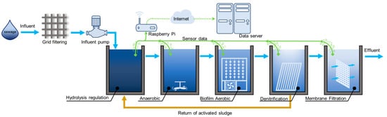 The DNN model developed in this research focuses on the WWTP setup based on dual-mode dynamic separation (DMDS) technology, as shown in Figure 1. The DMDS-based WWTP includes a hydrolysis conditioning tank, an anaerobic reaction tank, a biofilm aerobic reaction tank, a denitrification tank, and a fiber dynamic membrane filtration tank. After the preliminary filtration of wastewater through the grate, the wastewater is pumped into the hydrolysis tank by the lift pump for the preliminary water treatment, such as the precipitation of suspended impurities, hydrolysis of particulate matter, and pH adjustment. In the anaerobic tank, anaerobic bacteria are used to remove organic matter from the wastewater and to improve the biochemical properties of the wastewater for subsequent treatment. In the aerobic tank, the nutrients in the water are absorbed and transformed by the microorganisms through the biofilm, and the wastewater is de-nutrified accordingly. During this process, the fan continuously aerates the water to maintain the DO in a range that is conducive to the completion of active decomposition by aerobic microorganisms. The wastewater then flows into the inverse digester to further complete the denitrification process. Quartz sand is used as the membrane medium for denitrifying organisms and as a filtering structure for removing nitrate and suspended matter. A portion of the active sludge is allowed to flow back into the hydrolysis conditioning tank. In the final membrane filtration tank, dynamic biofilm interception and anti-pollution processing is carried out, and the microorganisms are quickly attached to form a piece of comprehensive biofilm by using a pre-coated biological agent-modified fiber mesh membrane as the support layer. After the processing in Figure 1, the water quality of the effluent flow is expected to meet the purification discharge standard in China.