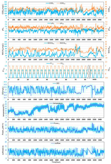 - In this WWTP setup, the sampling interval of the sensor is one minute, and in most of the time, the data value does not vary obviously within this interval. Therefore, in order to improve the learning efficiency, the mean value of the data within one hour is taken as the sampling point; in this way, there are 24 samples per day that will be recorded.