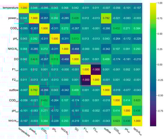 It is generally understood that there exists considerable inter-category correlation among the water quality parameters, which may affect the degree of convergence for the training of the LMPNet. Pearson’s correlation coefficient is an effective way to analyze the correlation among features based on covariance without considering the effect on the model analysis, and therefore, it was introduced to measure the correlation among the 12 water quality parameters []. The heat map in Figure 3 shows that there is a large positive correlation (0.623) between CODout and NH3-Nout, indicating that the COD content in this WWTP is related to the NH3-N content. F1run and F2run are in a regular alternating state of on and off, which presents the maximum negative correlation (−1), while the COD, NH3-N, and pH at the input and output are positively correlated (0.2~0.6) with each other. It can be seen that Power_1h shows the largest positive correlation (0.782) with the influent discharge outflow. The largest negative correlation (−0.468) is between the DO and NH3-N. Pearson’s correlation can only be used for the preliminary analysis of the intra-class correlation and the inter-class discriminability of the training set; however, there may be a very complex nonlinear correlation within the data which cannot be reflected.