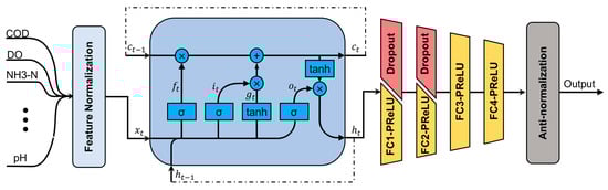As one of the most popular networks for temporal feature classification, the LSTM can dynamically memorize the changes in data with a structure of feedback connection []. Considering that wastewater treatment is a dynamic and continuous process, the one-layer LSTM cell in the LMPNet extracts the temporal features from the input data xt, such that,