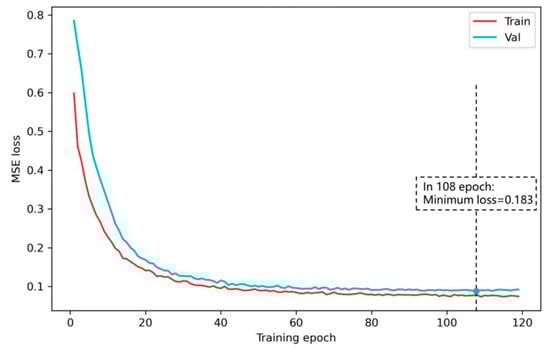 The decrease in the MSE loss value during training at each epoch iteration; the red curve is the training loss, while the blue curve is the validation loss. The minimum validation loss occurs at the 108th epoch with a loss value of 0.183.